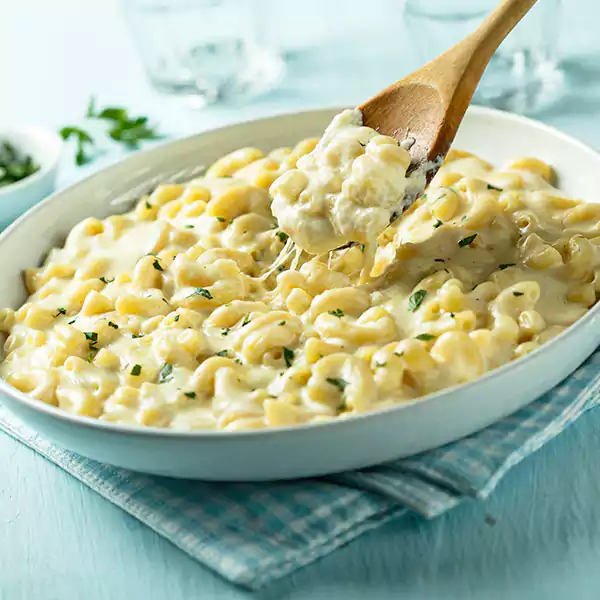Maccaroni Baked With Creamy Cheddar Sauce & Mozzarella Topped With Parmesan Cheese Crumbles