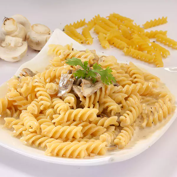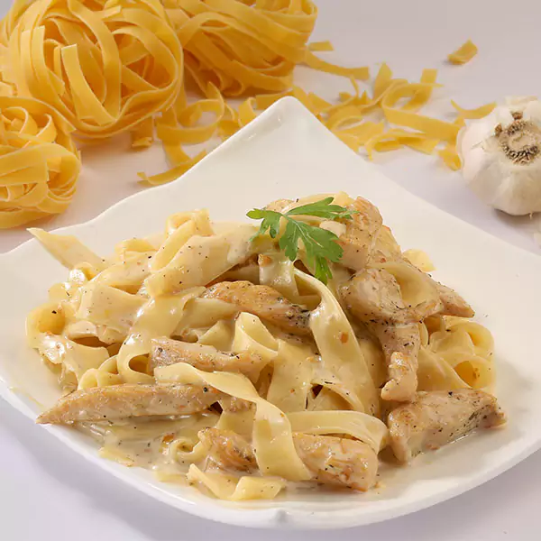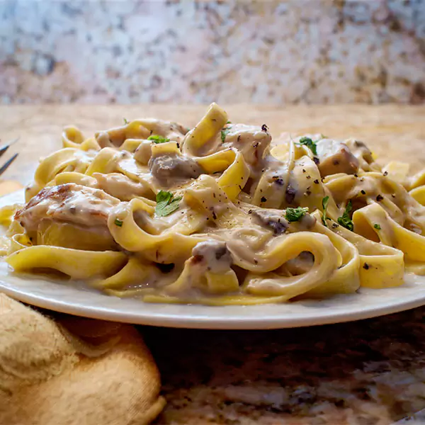 Roasted Chicken, Mushroom & Mozzarella Cheese In Alfredo Sauce Topped With Shaved Parmesan.