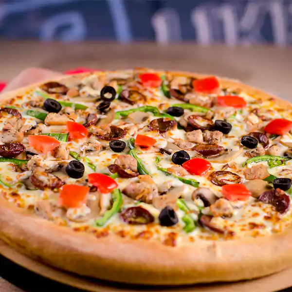 Pizza Loaded With Pepperoni, Roasted Chicken, Red Onion, Mushrooms, Bell Peppers & Black Olives