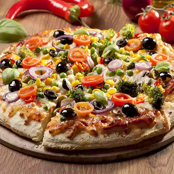 Thin Crust Pizza Baked With Mushrooms, Broccoli, Marrows, Cherry Tomatoes White Onion & Calamatta Olives.