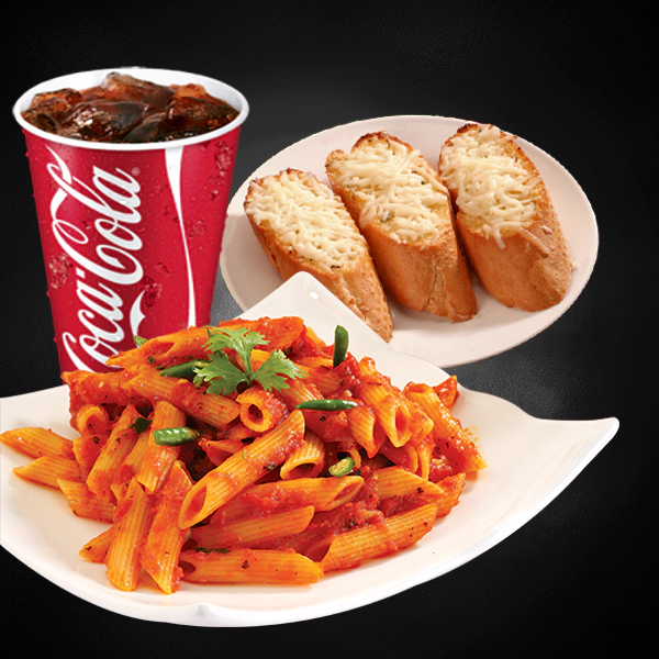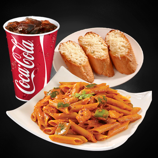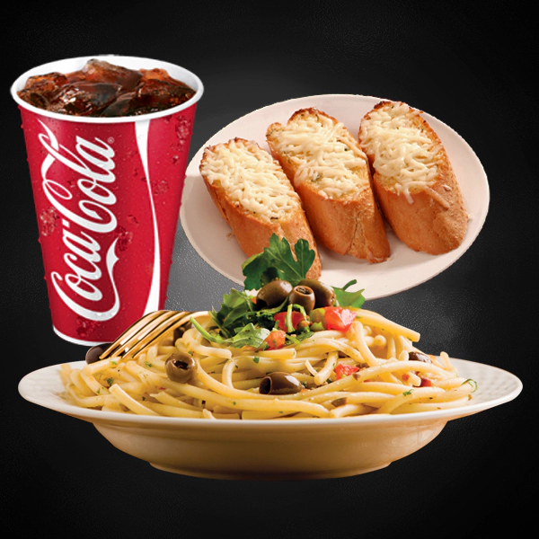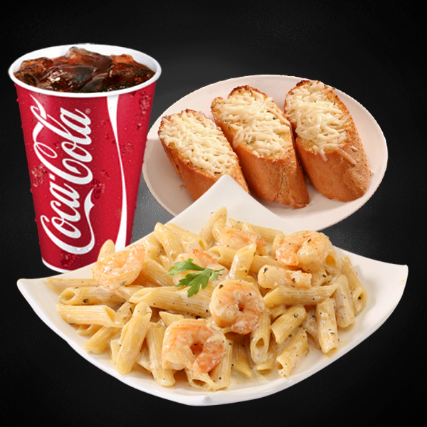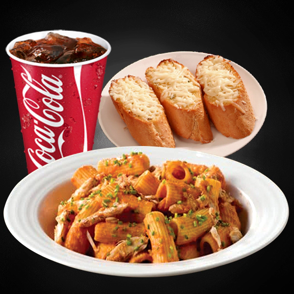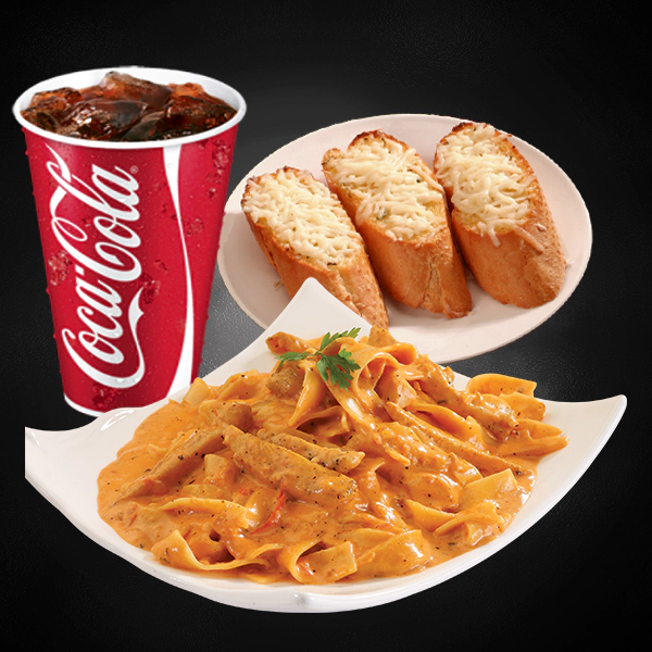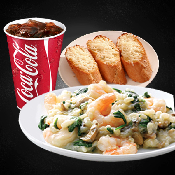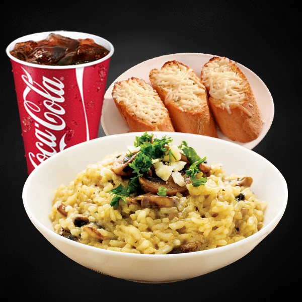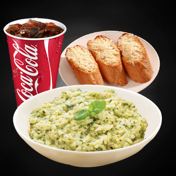Roasted chicken, italian arborio rice, creamy pesto sauce and sundried tomatoes. Served with 2 pieces of cheesy garlic bread and medium size soft drinks.