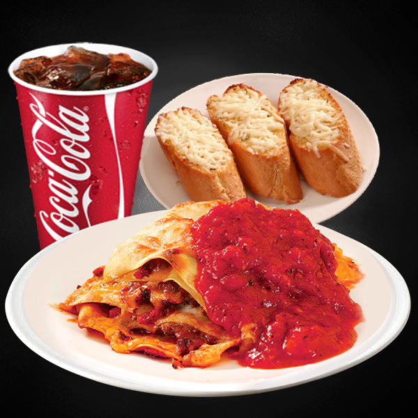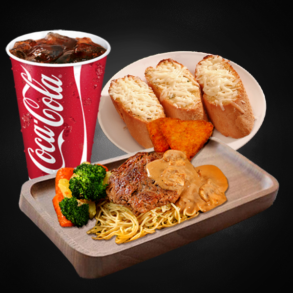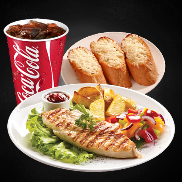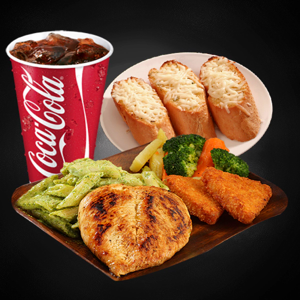Chargrilled tender chicken steak. Served with pasta, 2 side dishes with creamy marsala sauce. Served with 2 pieces of cheesy garlic bread and medium size soft drinks.