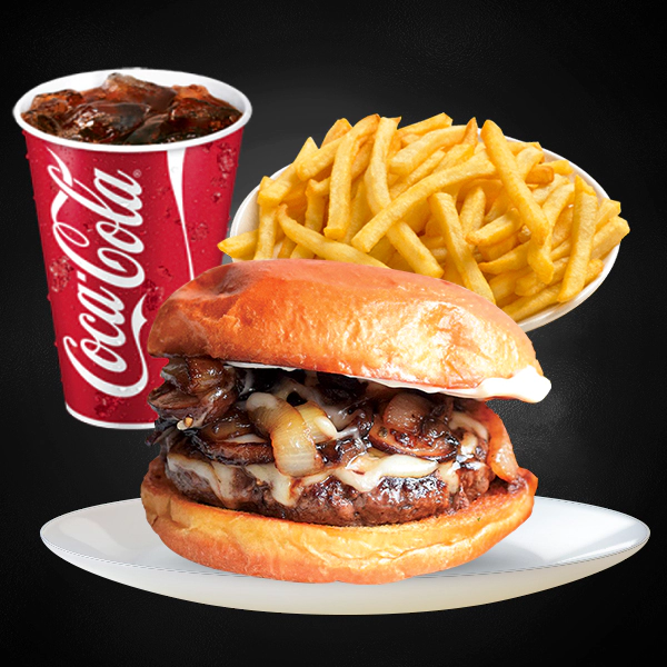 Grilled angus beef patty, spanish onions, mushroom glaze, monterey jack cheese, spinners signature sauce and supreme bun. Served with french fries and medium size soft drinks.