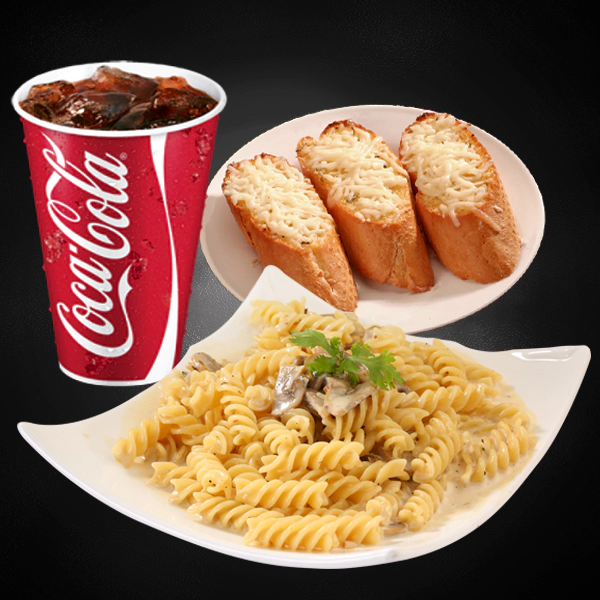 Spicy roasted chicken with parmesan, pesto rosso mushroom sauce, mashed potatoes and grilled vegetables. Served with 2 pieces of cheesy garlic bread and medium size soft drinks.